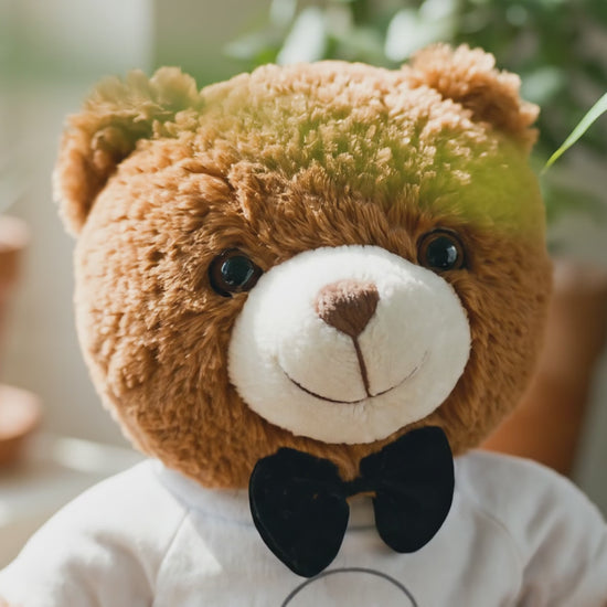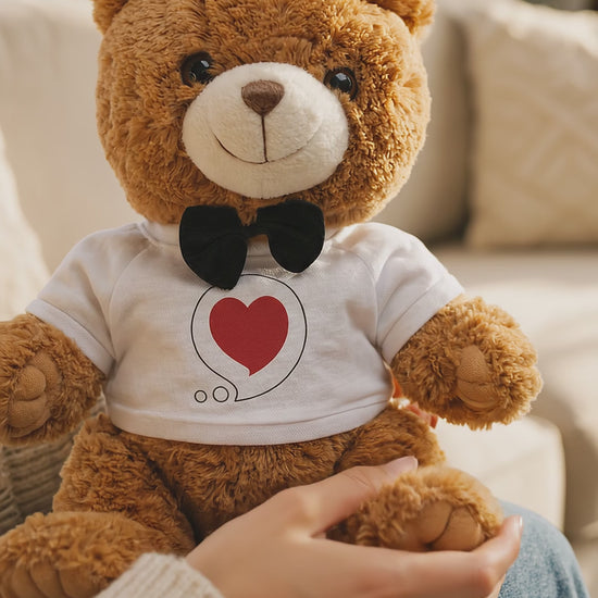 A soft, expressive companion designed to hold a little meaning in its arms. This seated light-brown teddy wears a crisp white tee featuring the Heart Bubble and a classic black bow tie — equal parts charm and quiet sentiment. At 7" x 10", it fits effortlessly on a bedside table, nursery shelf, or tucked into the corner of a desk, offering a gentle reminder that someone, somewhere, is thinking of you.